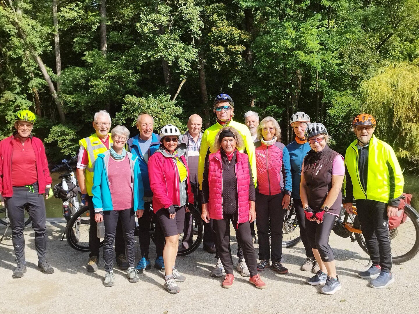 Die heutige Route hat aber auch ihren Charme. Von Baldham sind wir über Anzing zur Sempt-Quelle nach Forstinning geradelt. Die Quelle sprudelt dort kräftig und die Sempt nimmt sofort Fahrt auf. Wir sind ihr gefolgt, vorbei an Köppelmühle und Wolfmühle über Herdweg nach Ottenhofen, wo die Anzinger und Forstinninger Sempt zusammenfließen. Auch auf dem Weg nach Erding, vorbei am Wiflinger (Wörther) Weiher, sind wir der Sempt immer wieder begegnet. Der Zusammenfluss mit der Schwillach ist leider unzugänglich. Im Stadtpark von Erding haben wir eine Trinkpause eingelegt. Der Radweg aus der Stadt raus bis Aufkirchen war eine reine „Transport-Etappe“. Dann auf den Schotterweg neben dem Isar-Kanal, der war ziemlich ruppig. Da wird es im nächsten Jahr eine bessere Lösung geben. Zum Mittagessen sind wir beim Daimerwirt in Moosinning eingekehrt, wie immer eine gute Adresse. Es war schon so warm, dass wir sogar im Biergarten sitzen konnten. Zum Rückweg sind wir vorbei an den Moosinninger Fischweihern geradelt, über Eicherloh mit den Golfplätzen zu den Speicherseen. Weiter nach Landsham und Grub, durch Parsdorf bis Vaterstetten, wo es zum Abschluss Gelegenheit für Kaffee und Kuchen gab. Mit 72 km keine schwere Tour und die 200 Hm haben den 14 Teilnehmern auch keine großen Probleme bereitet. Wer allerdings in Ebersberg gestartet war, hatte abends fast 120 km auf dem Tacho. Respekt, Hermann.