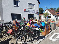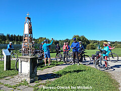 Dann ging’s langsam bergauf. Über Zaißing, Aschau und Schützen bis Mittbach. Dort haben wir die erste Pause gemacht. Nicht zufällig steht dort ein Obelisk zum Gedenken an General Moreau, der in der Schlacht von Hohenlinden (3. Dezember 1800) die französischen Truppen zum Sieg geführt hat. Ein Hund hatte ihm die Hose zerrissen, der Schneider vom nahen Gehöft hat sie wieder geflickt. Seitdem heißt der Hof Moroschneider. Der Kirchturm vom nahen Mittbach ist ein historischer Messpunkt für die Landesvermessung in Bayern. Überhaupt ist der ganze Landstrich zwischen Steinhöring, Maithenbeth und Hohenlinden das Aufmarschgebiet und der Austragungsort der Schlacht. Deswegen findet man in dem Gebiet viele Gedenksteine und Hinweistafeln. Wir sind weiter, haben bei Buchschachen das Flüsschen Isen überquert und sind ihm bis zur Urtlmühle gefolgt. Der Markt Isen ist nur ein Katzensprung entfernt, wir haben den nördlichsten Punkt der Tour erreicht. Vorbei an Tading, wo wir in früheren Jahren oft eingekehrt sind, waren wir schnell in Forstern beim Ristorante „Il Cavallino“. Wir konnten draußen auf der Terrasse sitzen und haben gut und günstig gegessen. Nach der Pause sind wir über Preisendorf nach Hohenlinden zum Denkmal an die Schlacht gefahren. Neben der Gedenkstätte sind Tafeln mit Hinweisen und Erläuterungen zum Schlachtverlauf installiert. Jetzt ging’s heimwärts. In dem Waldgebiet zwischen Kreith und Kraiß wollten die Römer eigentlich die „Römerstraße“ bauen, aber die Wege waren denen zu holperig. Im Ernst: Die Wege sind wirklich nicht gut, aber immer noch besser, als auf einer stark-befahrenen Straße zu fahren. Also nimmt man das Tempo raus und hält mehr Abstand. Wir sind über Thailing und Winkl und ab Weiding im Schuss zur B304. Dann den kleinen Anstieg zum Huber-Wirt in Oberndorf. Dort gab’s zum Abschluss Gelegenheit zu Kaffee, Kuchen oder Eisbechern. Danach hat sich die Gruppe aufgelöst, einige sind zurück nach Grafing-Bahnhof, andere nach Zorneding oder Emmering. Am Ende standen gut 60 km auf dem Tacho.